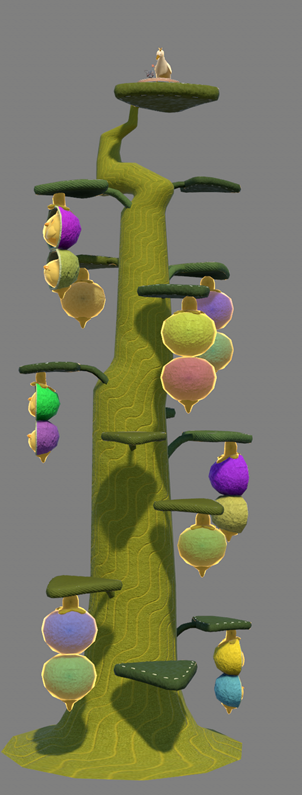 The art team designed a central landmark (a giant sprout inspired by the tale of Jack and the beanstalk) that served both narrative and gameplay needs (a vertical element marking the town hub).