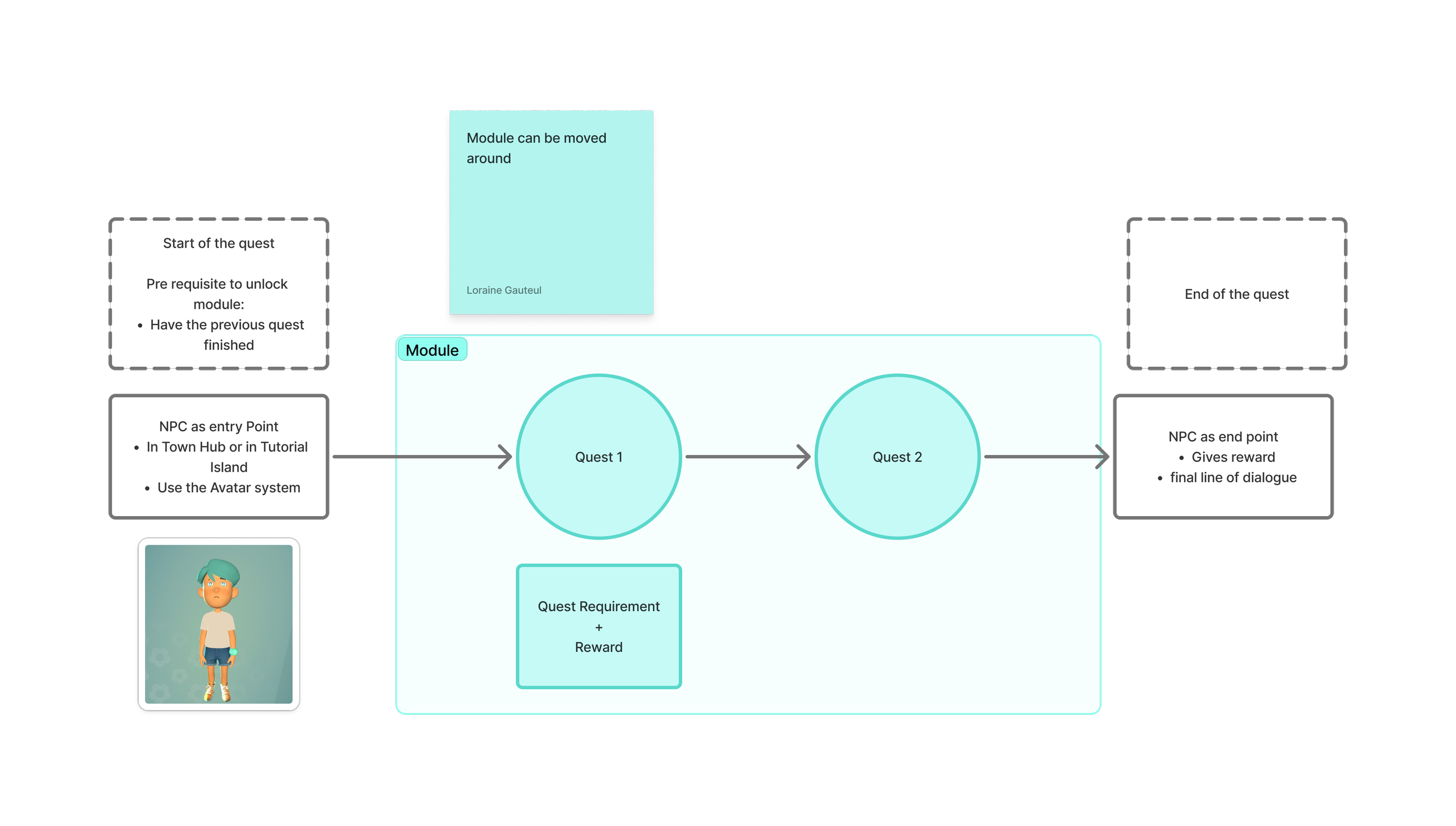 Narrative Cohesion: Each NPC was developed around 1–2 strong character ideas, with a tone reflecting their region’s identity. Their problems and quests tied back to the island’s Protector Spirit theme (e.g., Creativity, Unity, Freedom…).